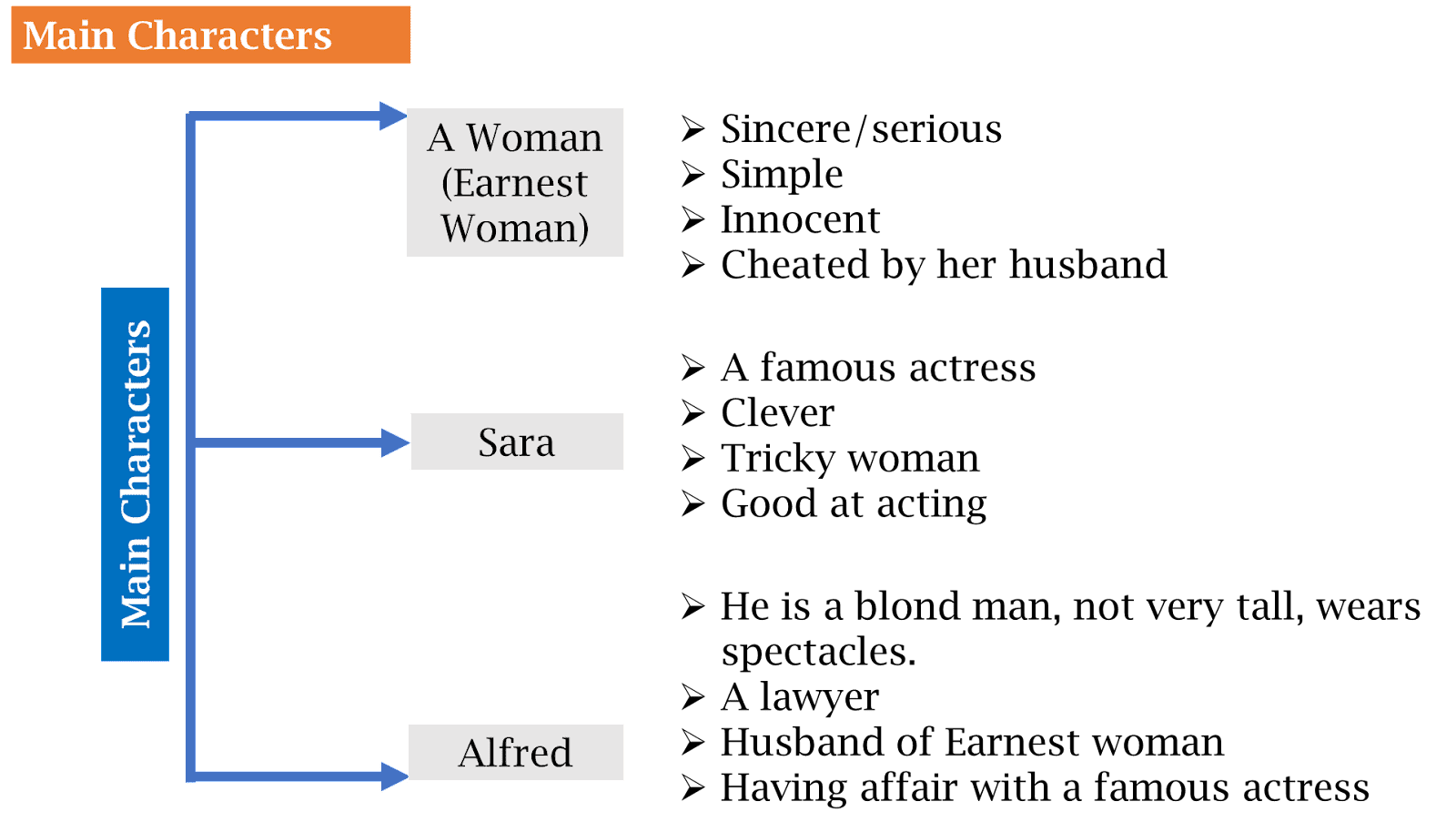 - The Famous Actress is a clever stage actress. She uses make-up to keep herself looking good all the time. She always maintains herself as gorgeous to attract guys. She has a talent for acting. She uses her acting abilities to persuade the young woman that she is not having an affair with Alfred. However, her deception and cunning are uncovered when we learn that Alfred is hidden in her private chamber. She is an unethical young lady who has an extramarital affair with Alfred.
